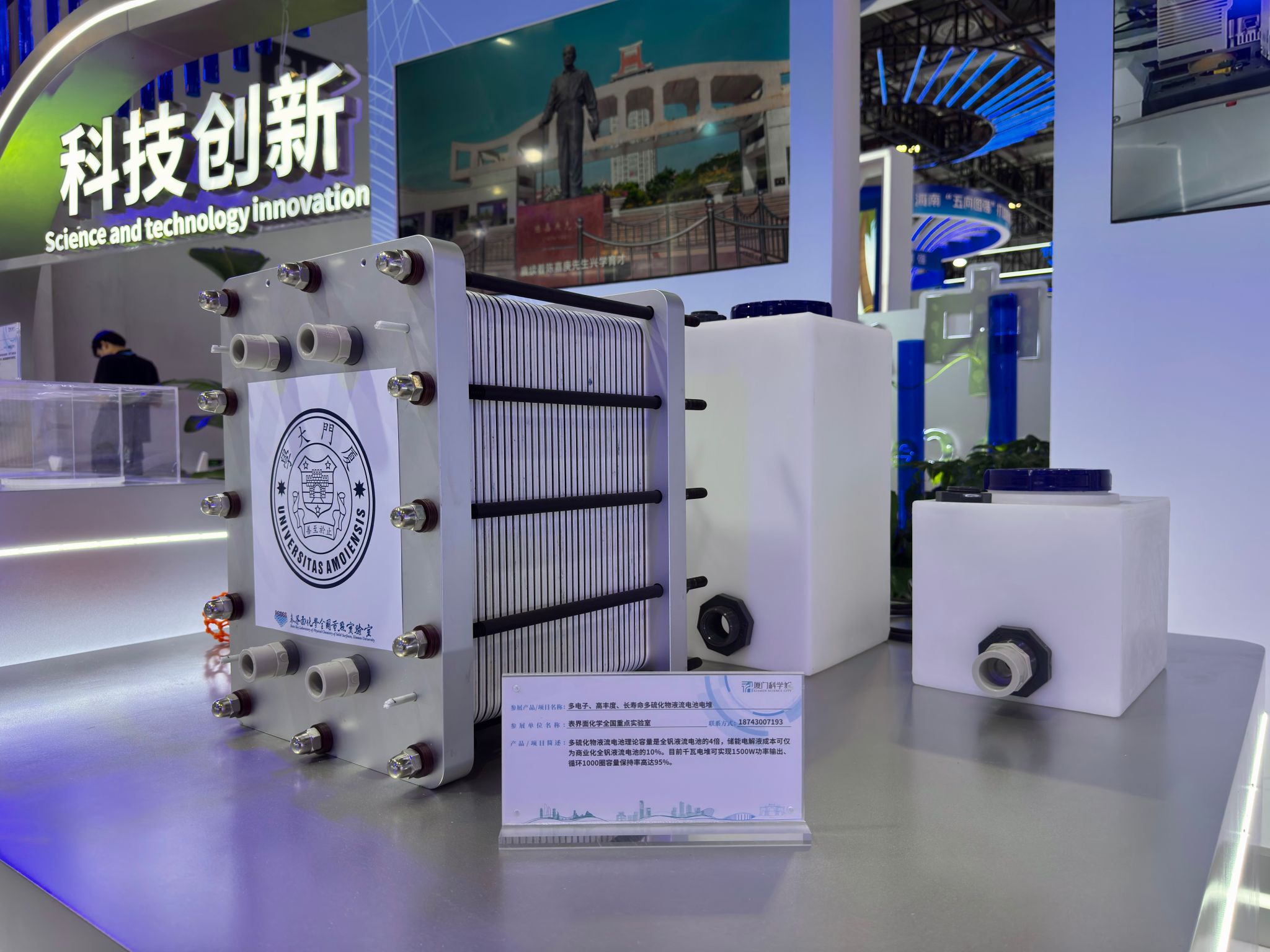 近日,厦门大学化学化工学院表界面化学全国重点实验室陈嘉嘉教授团队研发的KW级小型多硫化物液流电池电堆,在第二十五届中国国际投资贸易洽谈会上精彩亮相!这款液流电池电堆具备多电子反应、高元素丰度、长循环寿命等领先特性,代表了液流电池技术在规模化储能领域的新突破,为未来绿色能源存储提供了更高效、更经济的解决方案。依托厦门大学、嘉庚创新实验室与厦门市政府的深度合作,该项目融合人工智能与能源材料前沿研究,致力于推动储能技术从实验室走向产业化,...