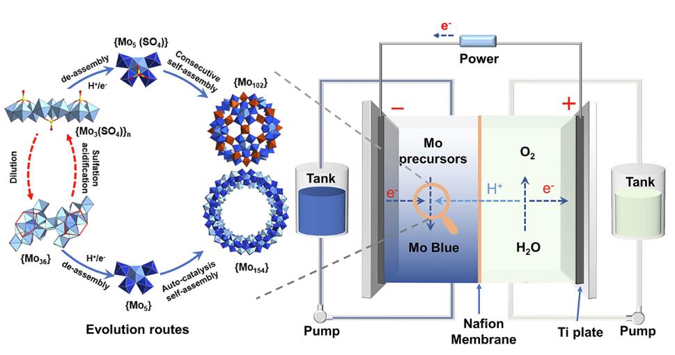 自下而上的自组装可以实现从建筑块自发组装成更大的、结构明确的各种规模的复杂结构和材料,可定向合成能源材料、生物超分子、电子存储等领域所需的功能材料。其中,巨型无机钼蓝团簇被认为是具有最高复杂程度的无机聚集体结构之一。然而,由于缺乏工况的表征手段,当前对于钼蓝完整的组装路径仍然没有明确的论述。
