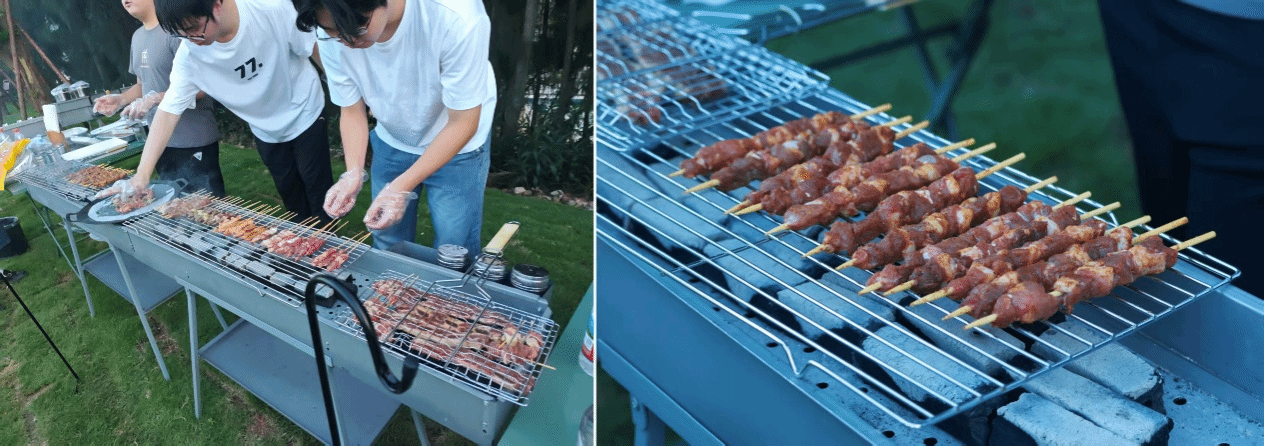 鸡翅、肉串在火焰上滋滋作响,大家围坐一旁,或动手翻烤,或惬意品尝。
